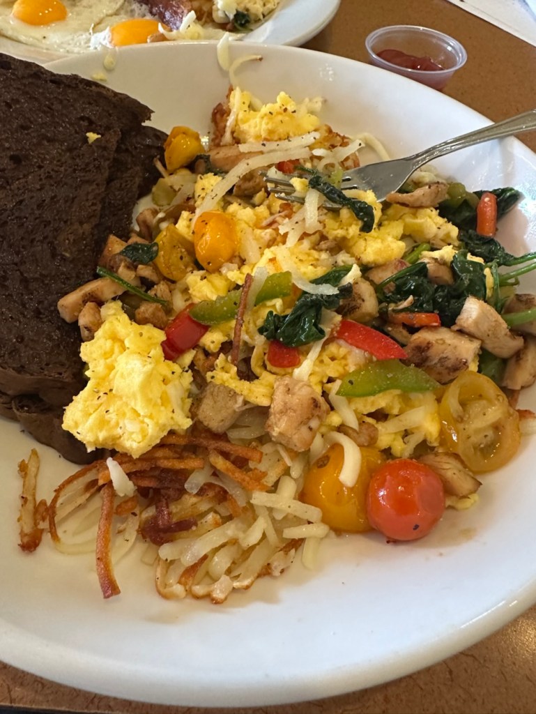 I got this VERY tasty egg scramble skillet with hashbrowns, spinach, cherry tomatoes, peppers and chicken (held the cheese!):
