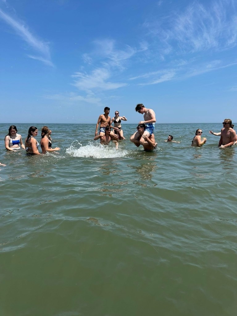 As I mentioned, Asher left Tuesday at 5 am for Virginia Beach with his swim team. Looks like he’s having a good time so far though the 4+ hours a day of swimming plus dryland training sounds exhausting. One of the moms posted this pic of them all at the beach – what a quintessential “teen summer” pic, no?