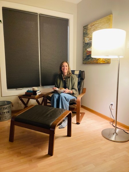 Here’s me in my adopted chair in the living room, where I ended up basically every day. (“It’s best for tall people!” Elisabeth would say. I felt a little guilty because IMO it was the best spot to stretch out. ;))