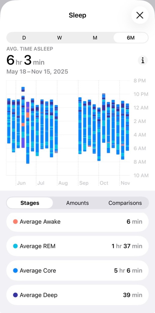 On another note, I was in a group chat this morning talking about sleep and amounts of deep sleep we are all getting… it got me looking at my sleep data from my Apple Watch.