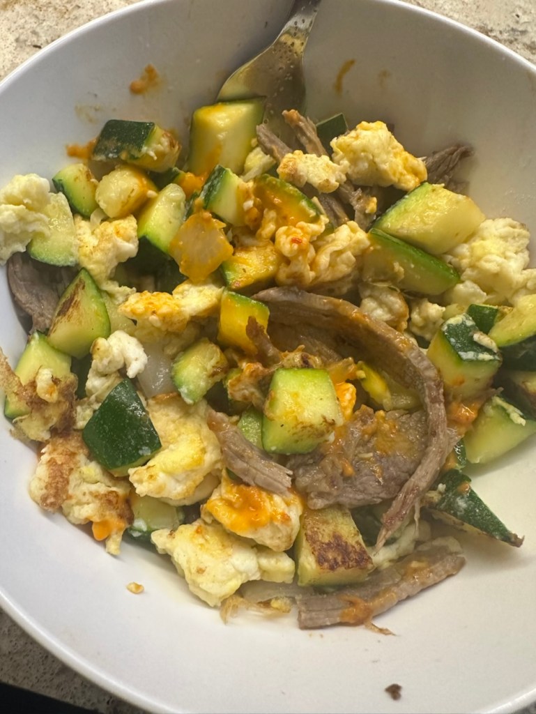 sample breakfast- 1 egg, 2 egg whites, zucchini, some leftover steak chunks, and salsa