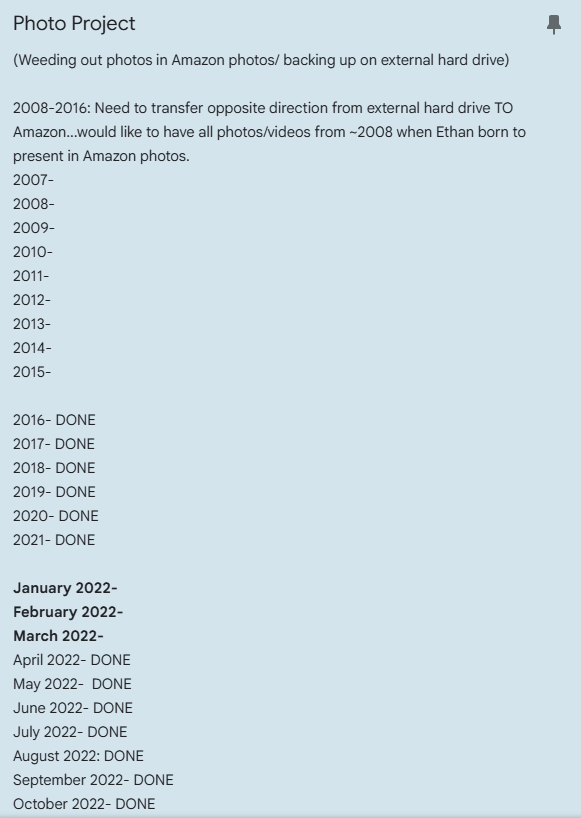 #1: Copy all pre-2016 photos + videos from the external hard drive –> Amazon Photos, creating a full online archive of my entire married life + the boys’ childhoods. (Also weeding out bloopers/ duplicates.)