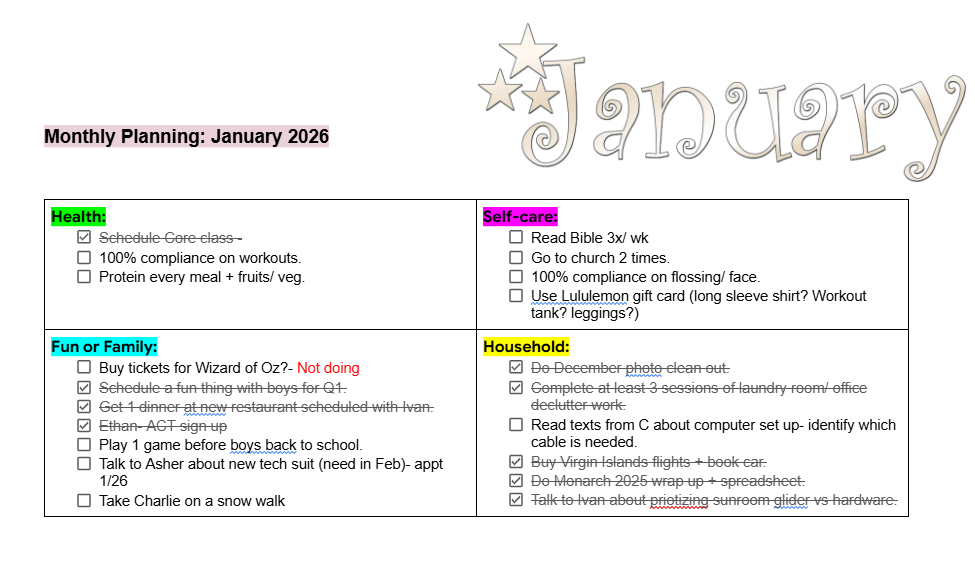 ✅I did a full 2025 Monarch audit and financial “stuff” clean up! This was quite the endeavor, as we got really behind from about mid-December on (through mid-January). I had approximately one million holiday charges to categorize, not to mention a bunch of returns, travel expenses, things needing reimbursement…When I get behind and this happens, I can end up with a lot of messy questions. Sometimes I don’t know exactly what a charge was for, or we’ll have a Zelle in from his brother to pay us back for something and I don’t know what it was for, the boys’ charges need sorting out and money transferred from them, etc.