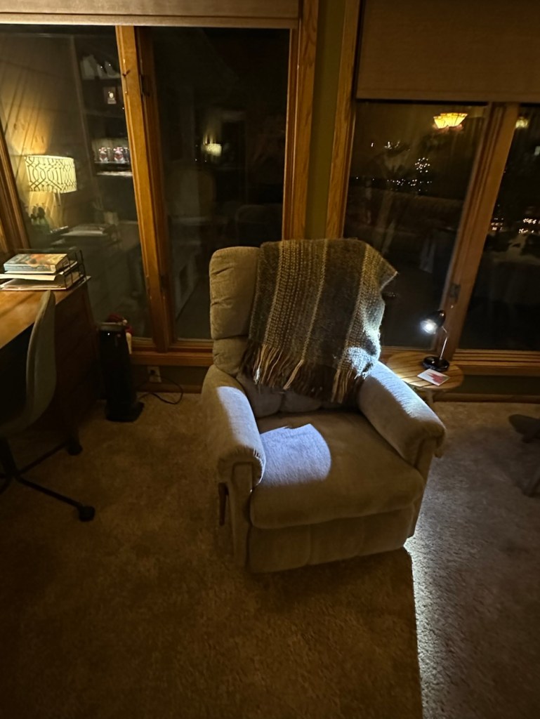 These are not the best pictures, but I’m not home right now so they’ll have to do. We ended up going with a La-z-Boy recliner, not the chair I’d originally picked out, but this one is super comfy and was on a hard to pass up sale. Goodbye, stained old glider with the ripped ottoman!
