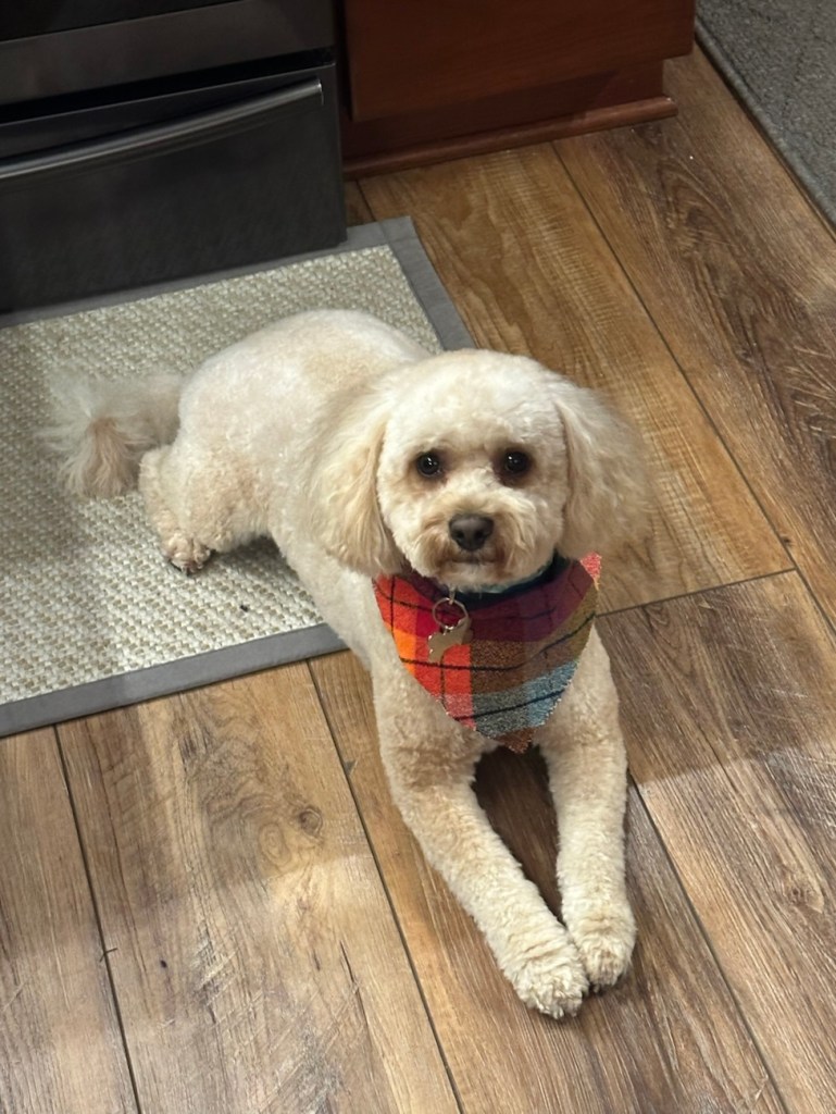 I am grateful for this little plaid bandanna that the groomer gave Charlie the other day. He looks so innocent and cute. haha. (In a few days, his SUPER TIGHT CURLS will grow back, but for the moment, he’s a fluff ball.)