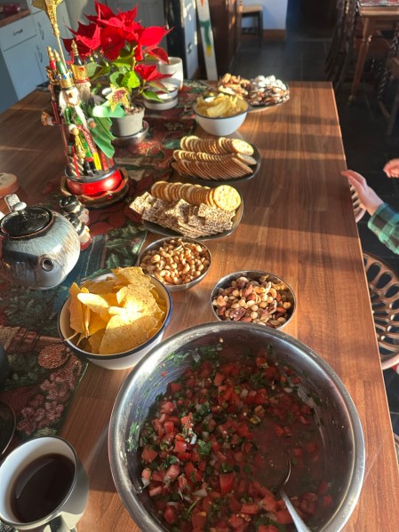 When we got home, it wasn’t long before we got the rest of Christmas Eve rolling! In our family, Christmas Eve is traditionally a “snacky” meal- cheese/crackers/ sausage, meatballs, chips + dip, cookies, things like that.