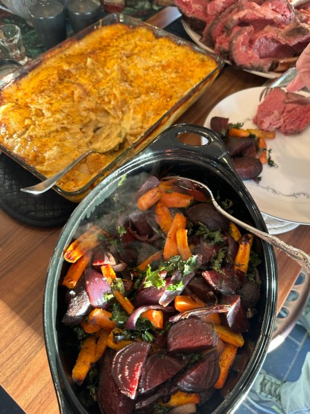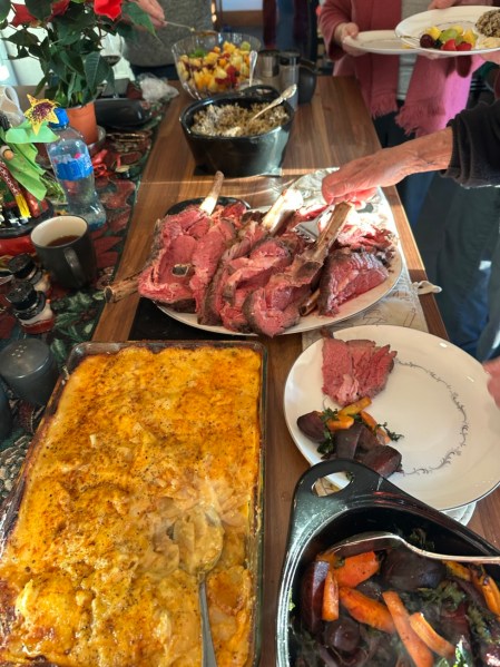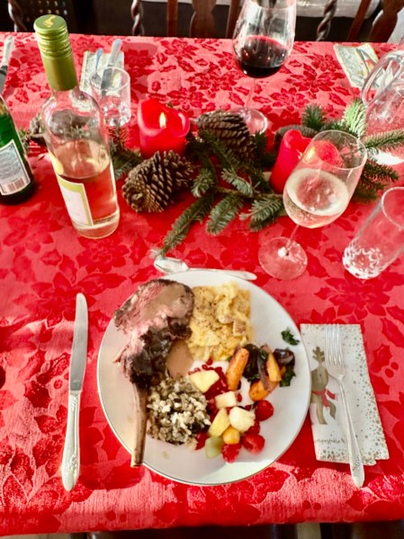 The main event on Christmas Day was a formal Christmas dinner in the afternoon. My sister and her husband made a BEAUTIFUL meal of prime rib, cheesy potatoes, roasted veggies and more with wine and even a flaming dessert.