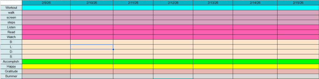 I fill this out first thing every morning (for the previous day), in bullet point format. (For workout, I just list what I did, e.g. “Full body strength #1”. For walk, I’ll just list “short loop x2” or “25 min”. Screen is the total from my screen time tracker app. Listen = what podcasts or music I listened to. Read= what book I read, if any…. Watch= what show/ content/movie I watched, if any. B/L/D/S = my meals.)