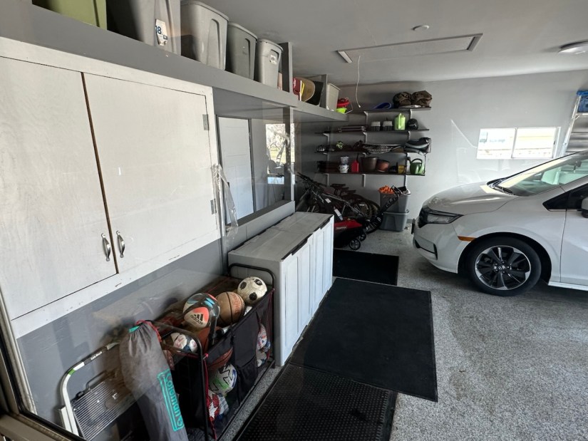The garage is awe-inspiring and that puppy is too funny.