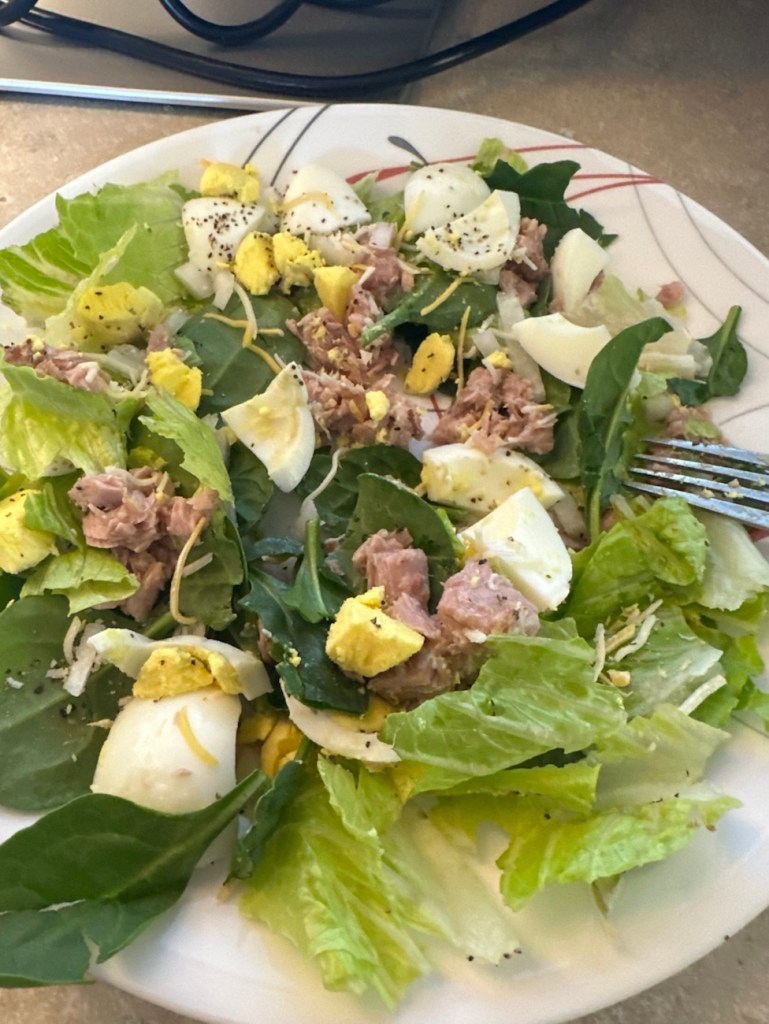A favorite salad from this week- tuna, onion, green apple, hard boiled egg, cheese and salsa verde on top (not shown). Writing that out, it sounds a little strange. But it’s delicious.
