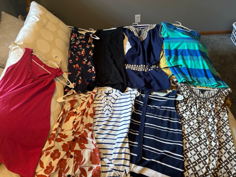 I also pulled out (most) of my summer dresses (which were hanging in a storage closet downstairs)…. o.m.g. I did not realize I had so many!! 😳 Probably did NOT need to buy any new sundresses…. 😂 (But in my defense, some (or at least many) of these dresses are quite old now, and I HAVE worn them many, many times (on vacations). Living in Wisconsin, though, and also living a pretty casual lifestyle, I actually do not wear these dresses very often in my day-to-day life, so even the old ones are still in excellent condition. I guess I was just itching for a couple of new/fresh things…)