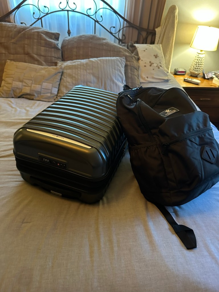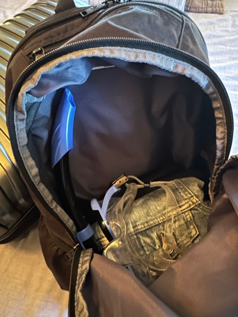 My Adidas backpack “personal item”- has a pair of sneakers at the bottom, a jean jacket, snorkel and mask, plus my makeup bag and 1 quart liquid bag will go on top. 🙂
