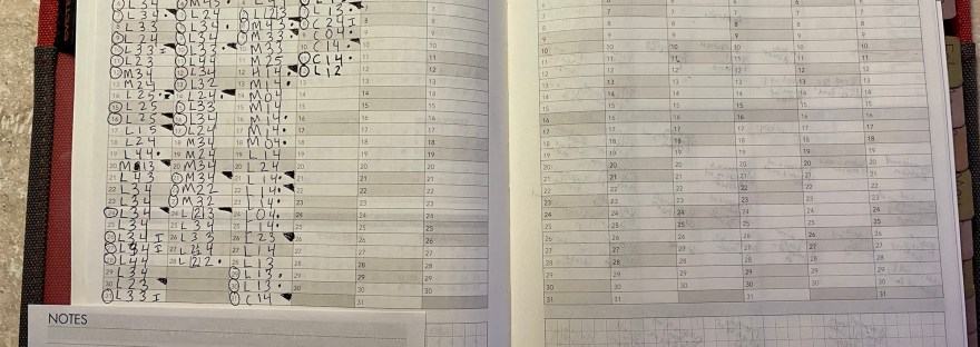 In the front of my Wonderland 222 planner there is this "Yearly" page, with little boxes for each day of the year. The whole year is spelled out over just 2 pages. These boxes don't leave a lot of room for writing, but I've developed a little code system that allows me to track a… Continue reading Mood tracking